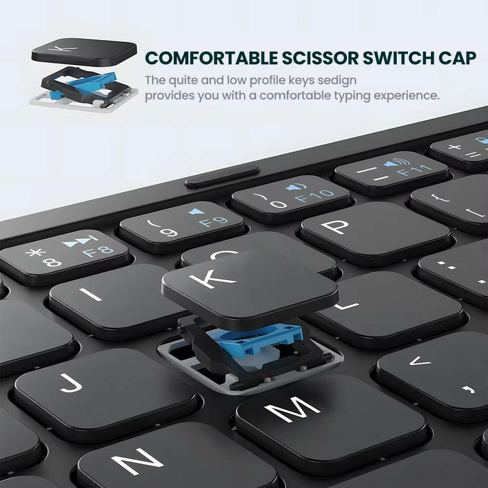 [ Universal Compatibility ] - This portable keyboard is compatible with iOS, Android, and Windows systems, allowing for seamless connectivity with all your essential devices. With three Bluetooth channels, switching between up to three devices is effortless with just a tap of a hotkey. Experience a reliable connection from up to 33 feet away, ensuring ultra-stable performance and low latency. The keyboard also remembers your last connected devices, simplifying your workflow across different platforms. (Please note: the touchpad functionality is not supported on iOS versions below 13).
