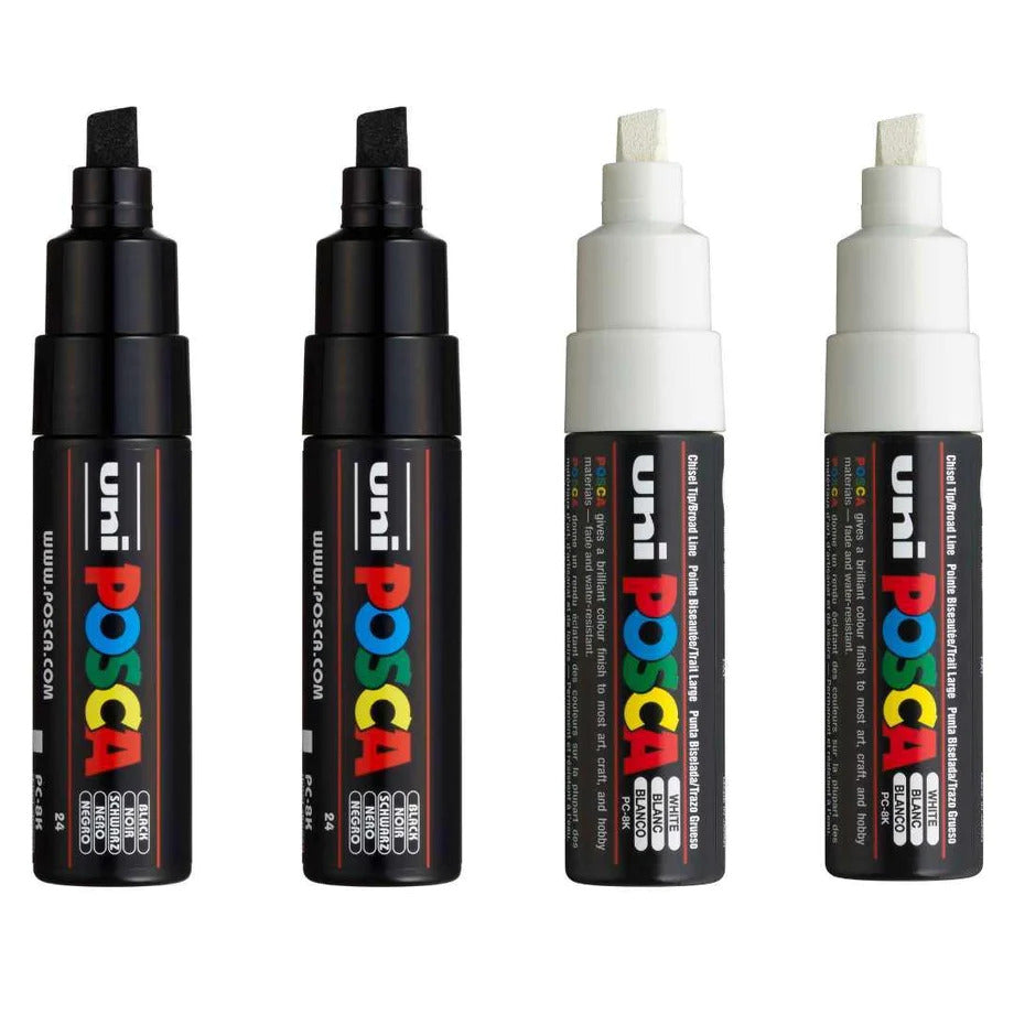 Uni Posca PC-8K 8.0mm Bold Chisel Black & White Markers Set of 4